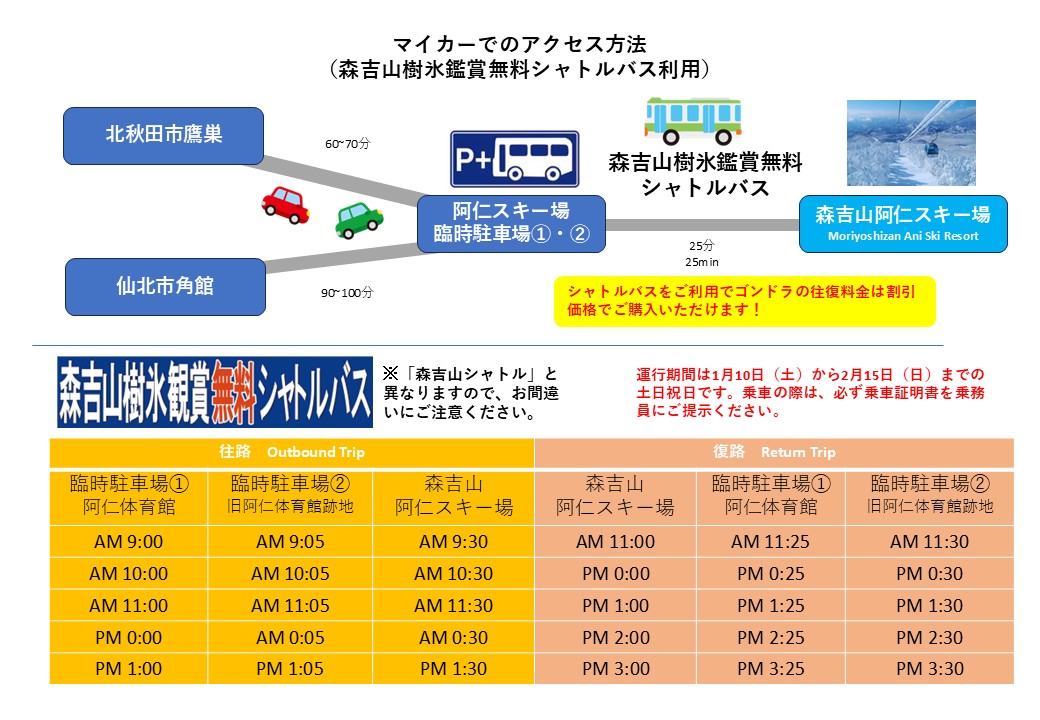 お車(マイカー)でお越しのかたは、阿仁合の町中にある臨時駐車場から無料のシャトルバスでの送迎が行われます。ゴンドラの往復料金が割引になるサービスも行われますので、ぜひご利用ください。