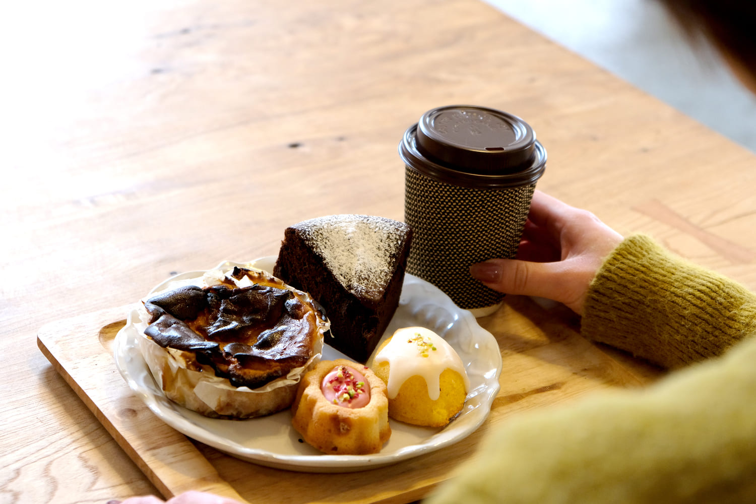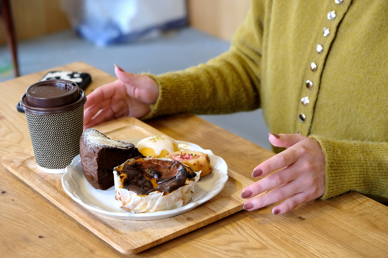 この日は、4種類の焼き菓子をダージリンティーと一緒にいただきました。かわいらしいお花の形の「ティグレ」は、アーモンドとバターが香る生地にチョコレートを流し込んだスイーツで、ピスタチオとピンクペッパーの風味が効いています。オイルフリーで仕上げたガトーショコラは、米粉とは思えないほどしっとりとした食感で、罪悪感なくカカオの豊かな風味を楽しめる嬉しい一品。自然栽培レモンを使ったレモンケーキや、北秋田市産の自然栽培サツマイモを使ったバスクチーズケーキも、やさしい味わいに心がほっとします。
