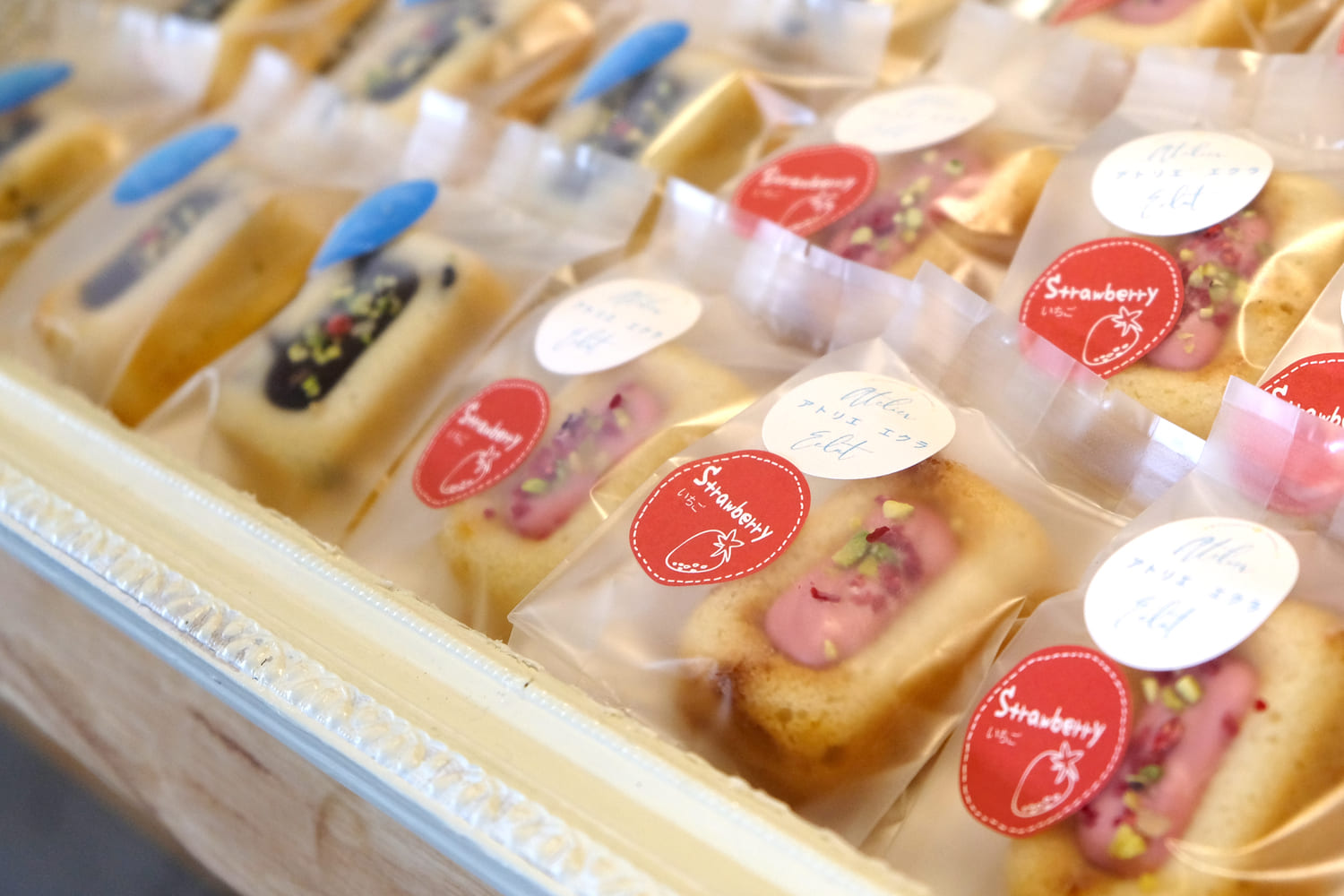 鷹ノ巣駅前通りにある小さな焼き菓子店「アトリエ エクラ」では、米粉を使ったグルテンフリーのお菓子を販売しています。店内にはイートインスペースもあり、フェアトレードの紅茶やオーガニックコーヒーと一緒にゆっくり味わうことができます。
