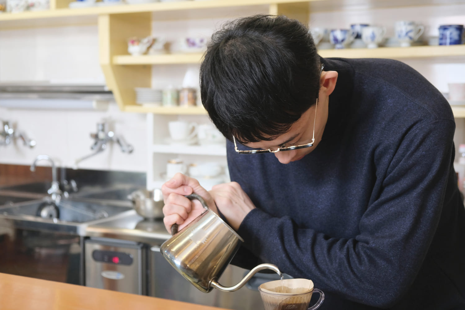 コーヒーと真剣に向き合う、店長でバリスタの田口さん。隣接する音楽教室の講師を務めるご家族と一緒に店頭に立っています。