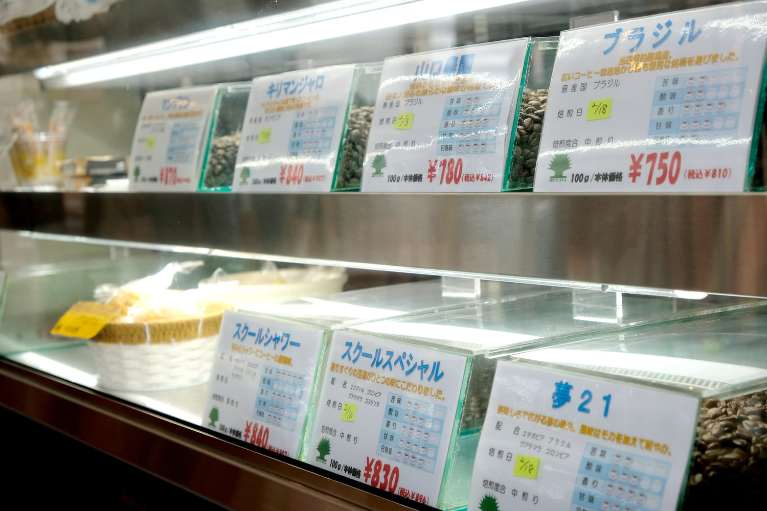 「大館珈琲館」はその名の通り、コーヒーが主役のお店。ショーケースには、ブレンドやシングルオリジンなど数種類の珈琲豆が並びます。すべてお隣・弘前市の老舗、成田専蔵珈琲店を手がける弘前コーヒースクールを通じて仕入れており、豆の販売も行っています。