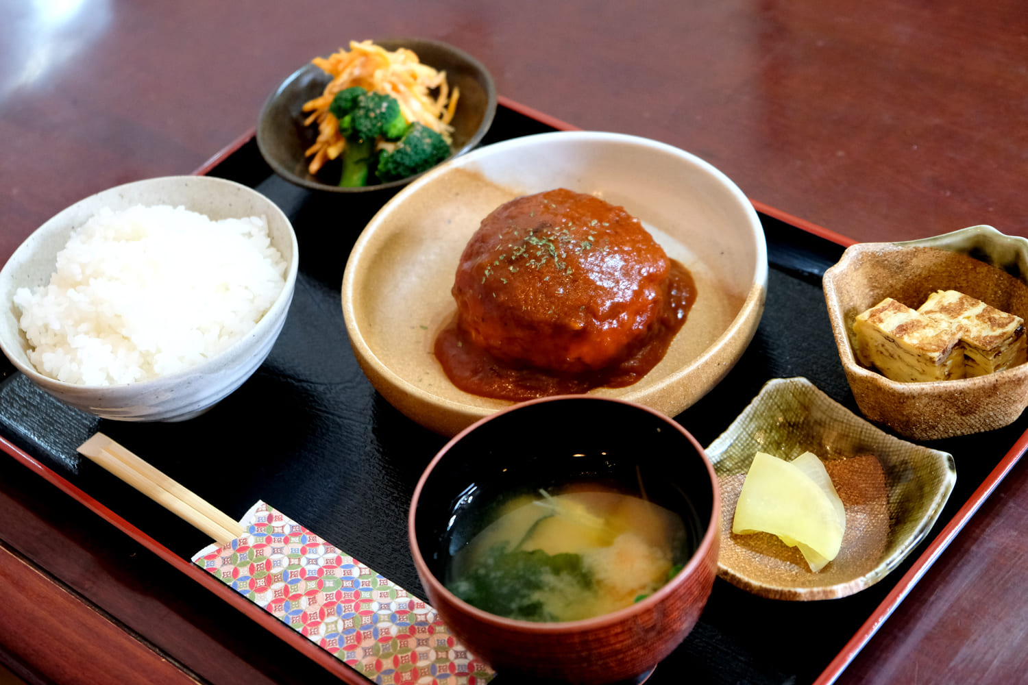 最初に食べたお客の名前をメニュー名にしたという「かっちゃん丼」や、目玉焼きがのった「カルボナーラ」など気になる品が並ぶ中、この日は「とうふハンバーグ定食」を注文。ころんと丸みのあるハンバーグは、箸を入れるとほろりとほどけるやわらかさで、コクのあるデミソースがやさしい味を引き立てます。ごはんと味噌汁に加え、卵焼きなどの小鉢が付くのも嬉しいポイントです。