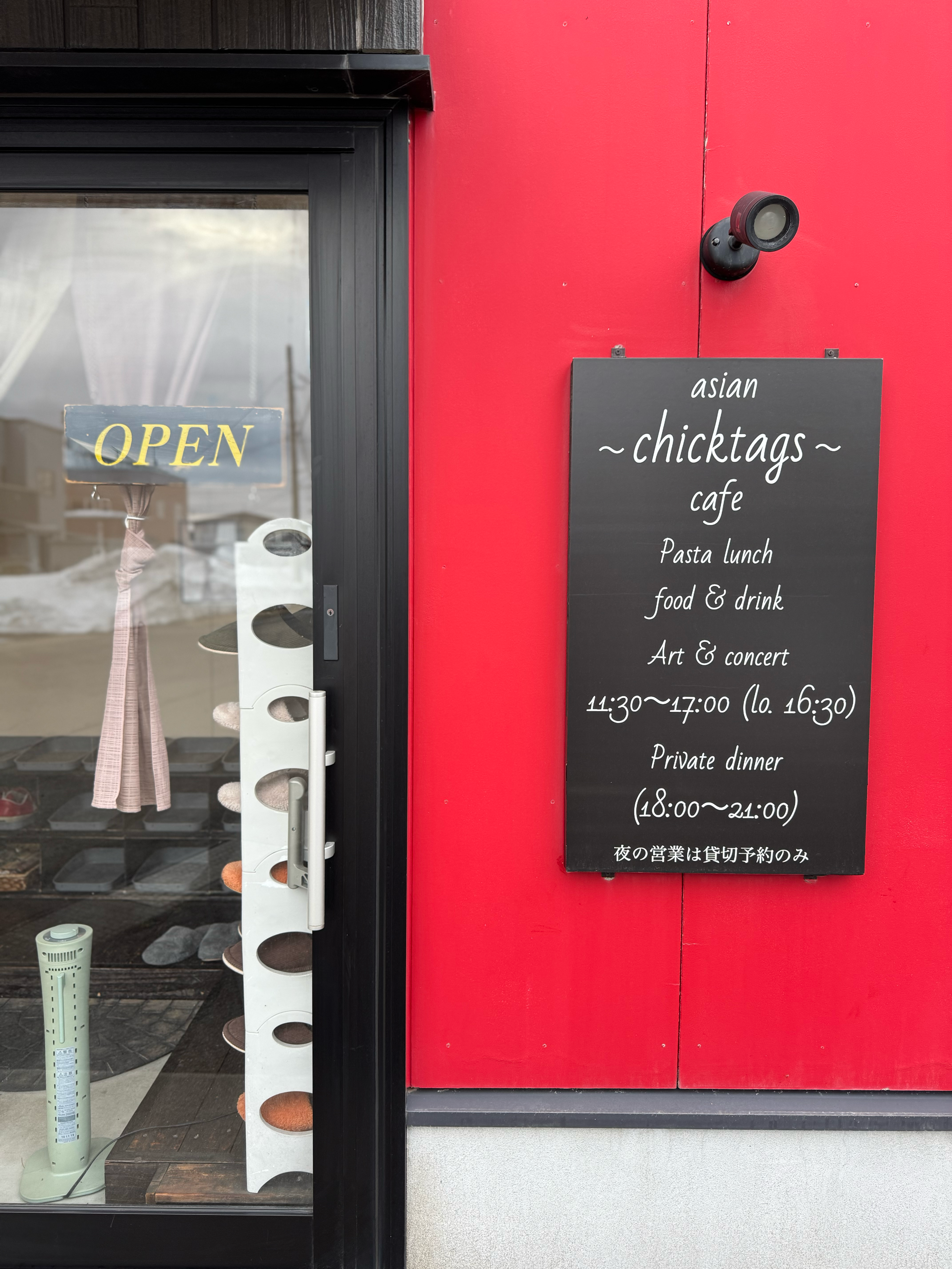 住宅街の中でひときわ目を引く赤い外観のasian chick-tags cafeは、ジャズやブルースが静かに流れる落ち着いたカフェ。