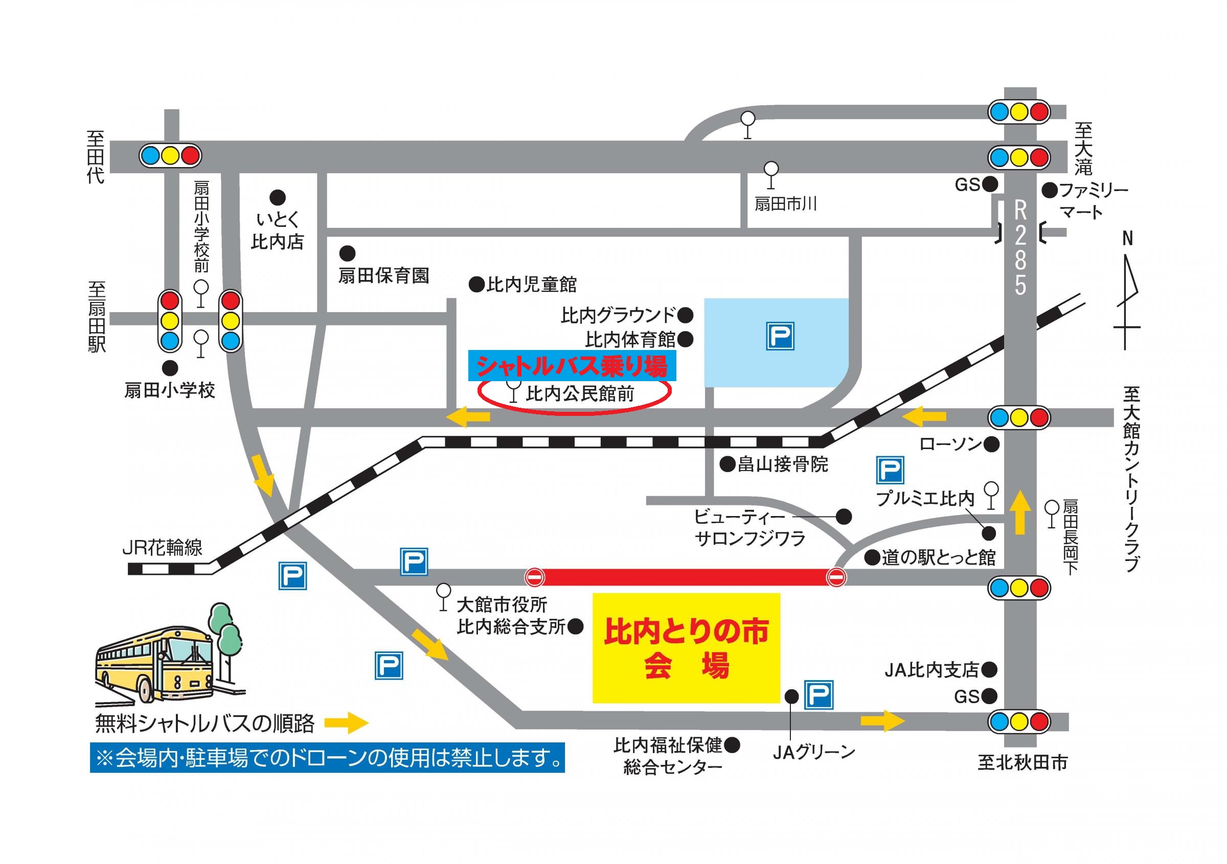 比内公民館と会場(大館市比内支所)をつなぐシャトルバスが約15分間隔で運行しております。