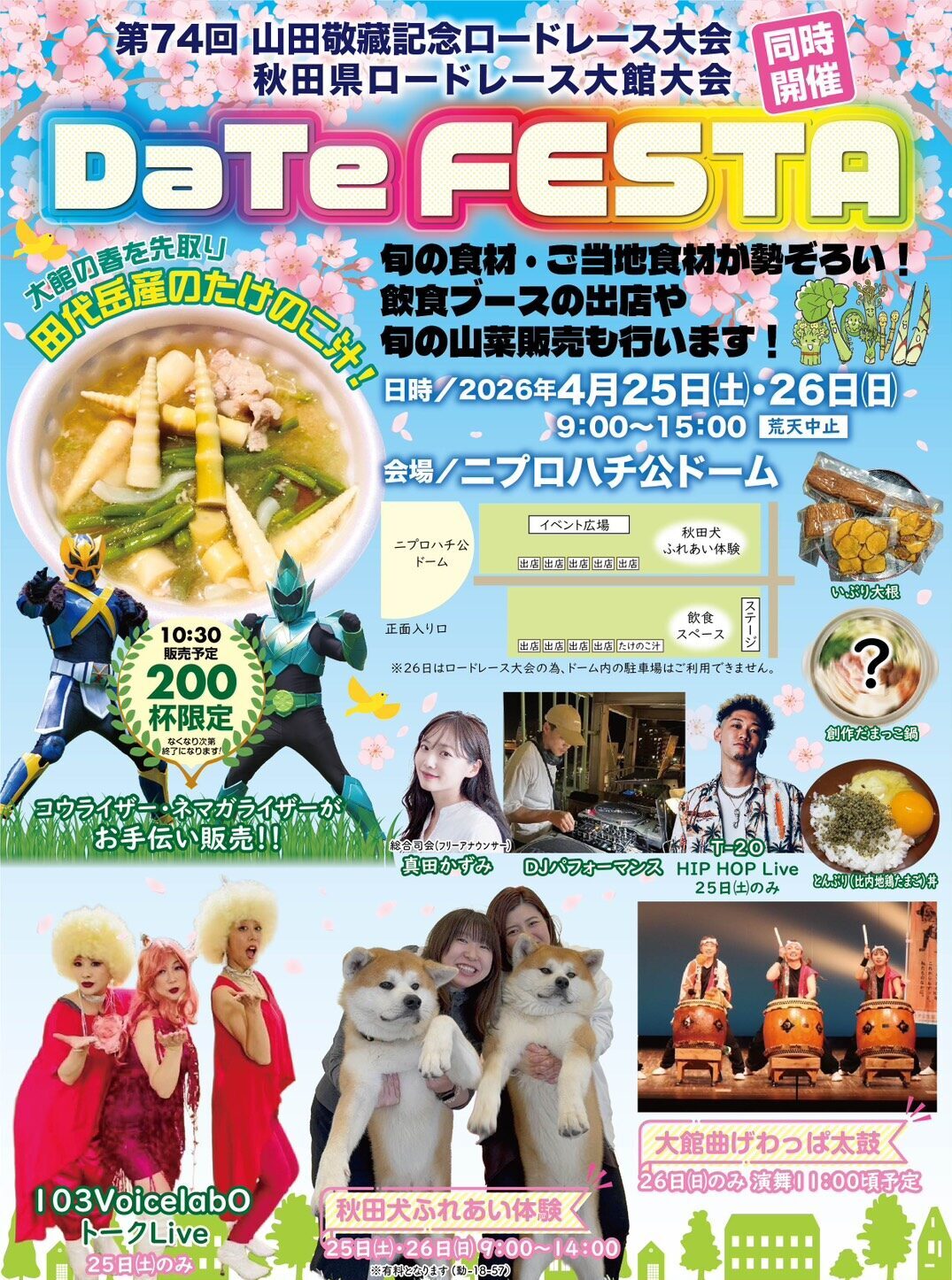 ランナーの発着点である「ニプロハチ公ドーム」では、開催地大館市の自慢の食や多彩なパフォーマンスを楽しめる「DaTeFESTA」が同時開催されます。